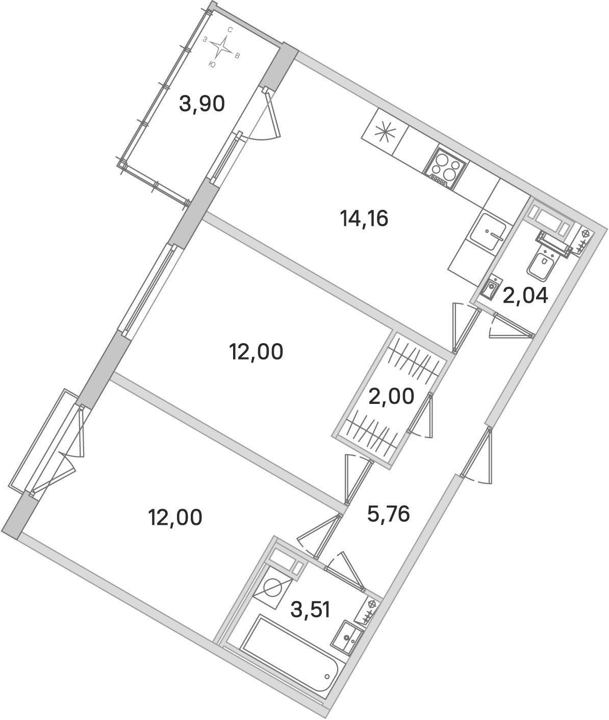 Двухкомнатная квартира на 3-ем этаже 51,47 кв.м