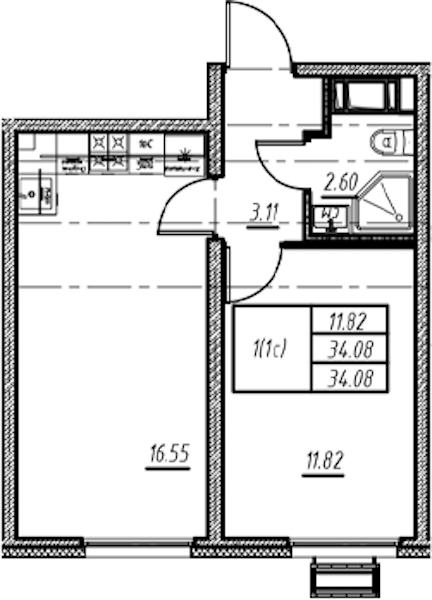 Однокомнатная квартира на 3-ем этаже 34,08 кв.м