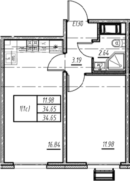 Однокомнатная квартира на 9-ом этаже 34,65 кв.м