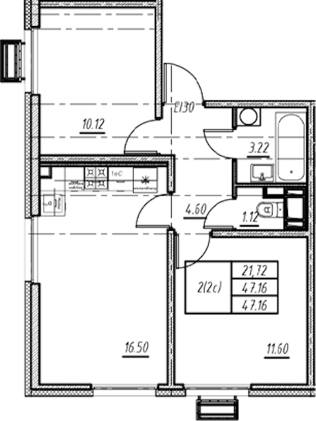 Двухкомнатная квартира на 19-ом этаже 47,16 кв.м