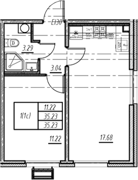 Однокомнатная квартира на 8-ом этаже 35,23 кв.м