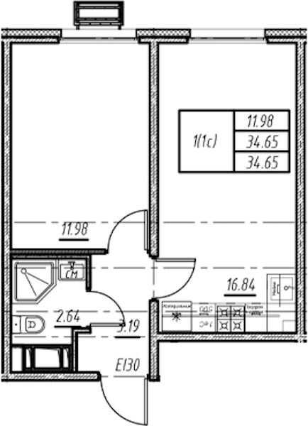 Однокомнатная квартира на 20-ом этаже 34,65 кв.м