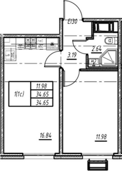 Однокомнатная квартира на 7-ом этаже 34,65 кв.м