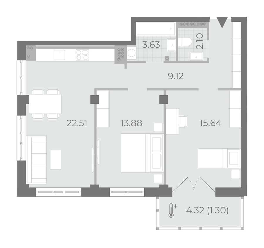 Двухкомнатная квартира на 8-ом этаже 68,8 кв.м