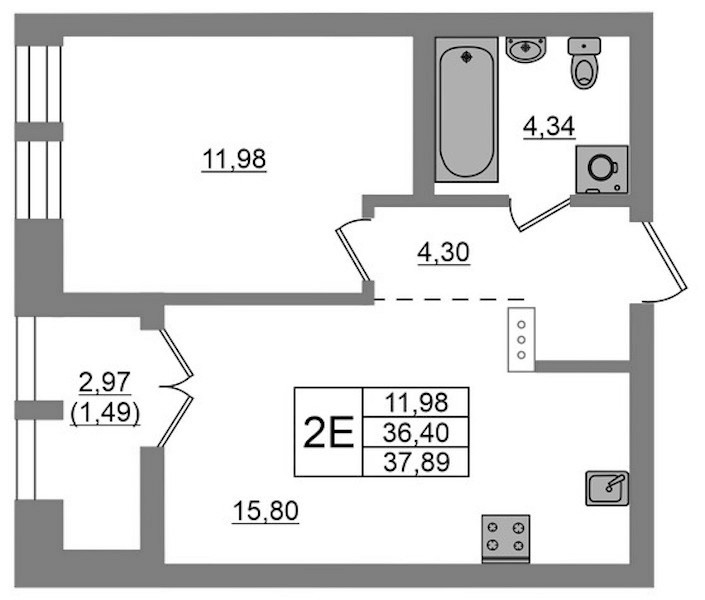 Однокомнатная квартира на 3-ем этаже 37,89 кв.м