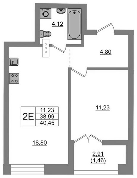 Однокомнатная квартира на 7-ом этаже 40,45 кв.м
