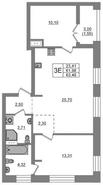Двухкомнатная квартира на 7-ом этаже 63,48 кв.м