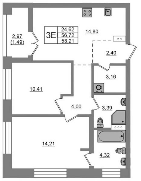 Двухкомнатная квартира на 9-ом этаже 58,21 кв.м