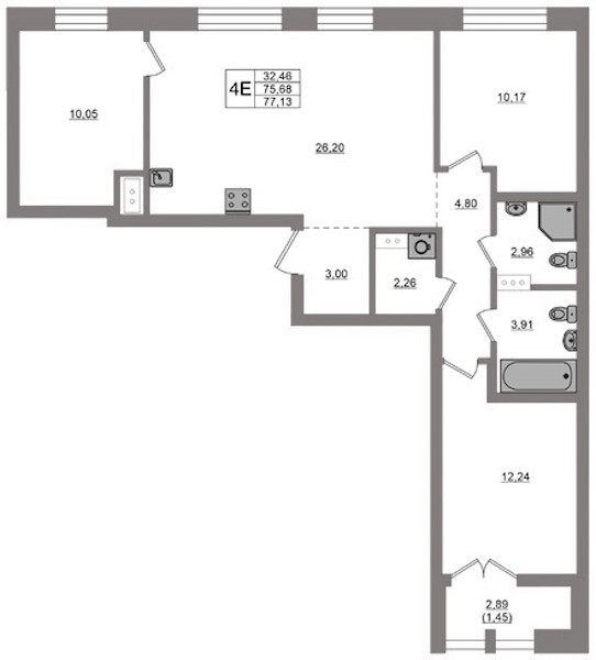 Трёхкомнатная квартира на 9-ом этаже 77,13 кв.м