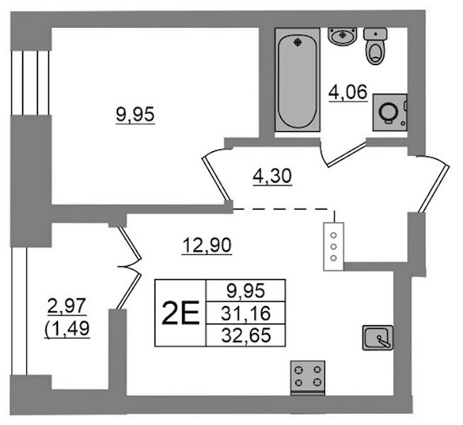 Однокомнатная квартира на 3-ем этаже 32,65 кв.м