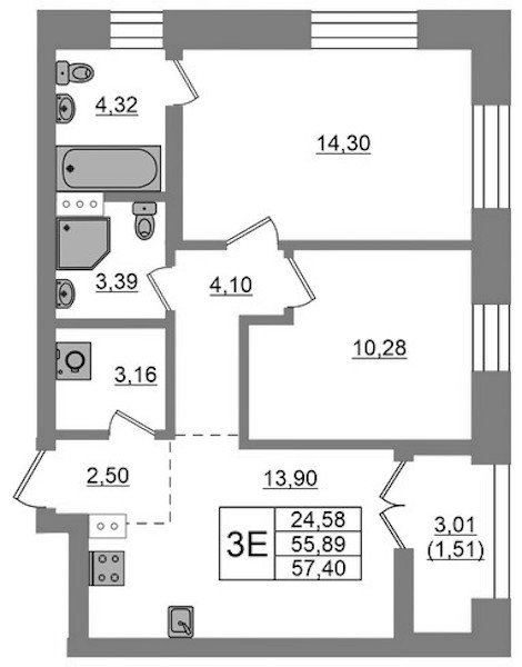 • Площадь57,4 м2