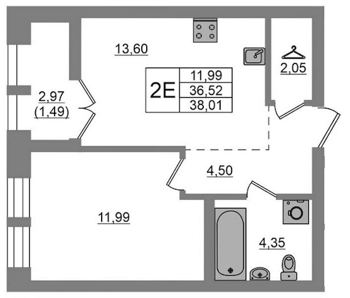 Однокомнатная квартира на 2-ом этаже 38,01 кв.м