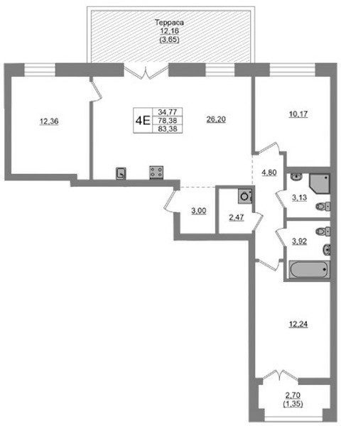 Трёхкомнатная квартира на 2-ом этаже 83,38 кв.м