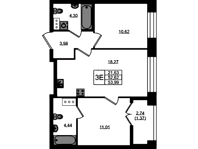 Двухкомнатная квартира на 9-ом этаже 53,99 кв.м