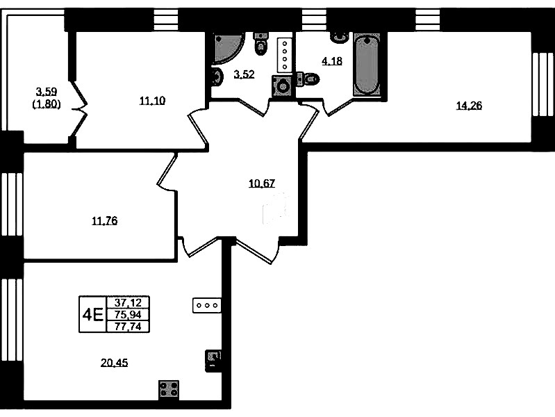 Трёхкомнатная квартира на 5-ом этаже 77,74 кв.м
