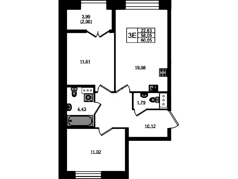 Двухкомнатная квартира на 3-ем этаже 60,05 кв.м