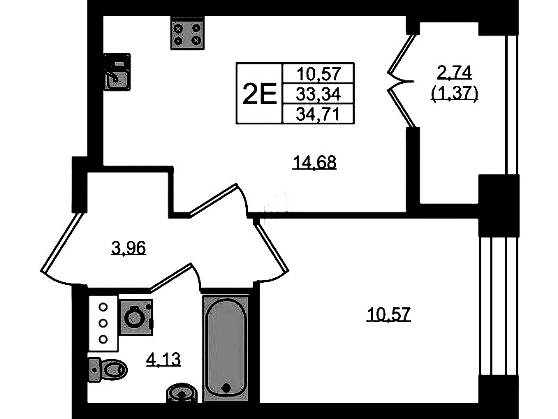 Однокомнатная квартира на 5-ом этаже 34,71 кв.м