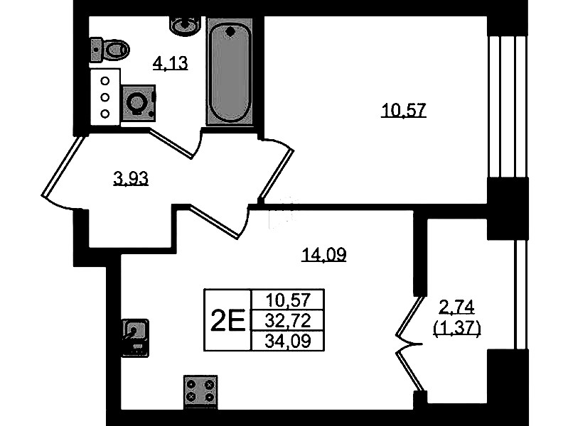 Однокомнатная квартира на 7-ом этаже 34,09 кв.м