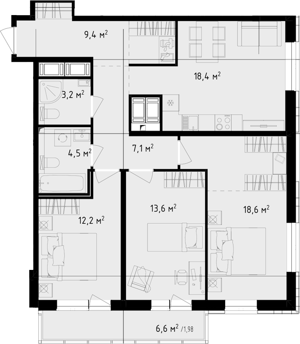 Трёхкомнатная квартира на 22-ом этаже 88,98 кв.м