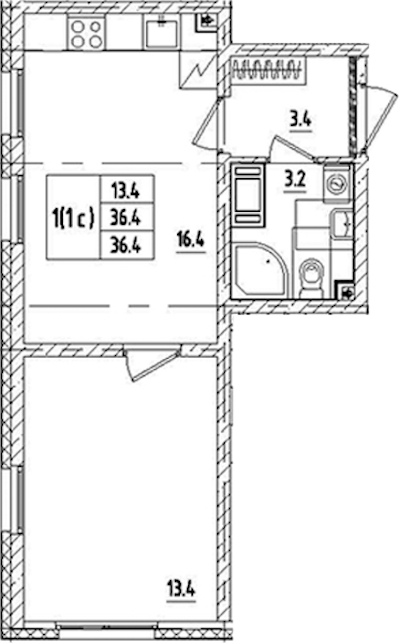 Однокомнатная квартира на 6-ом этаже 36,4 кв.м