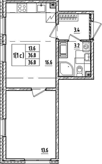 Однокомнатная квартира на 16-ом этаже 36,8 кв.м