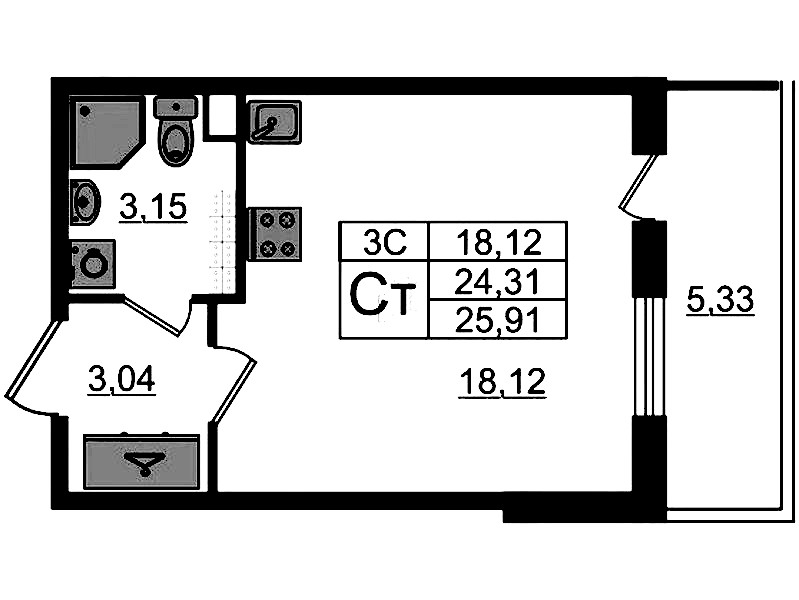 Квартира-студия на 5-ом этаже 24,31 кв.м