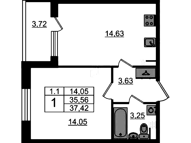 Однокомнатная квартира на 3-ем этаже 35,56 кв.м