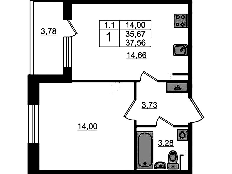 Однокомнатная квартира на 2-ом этаже 35,67 кв.м