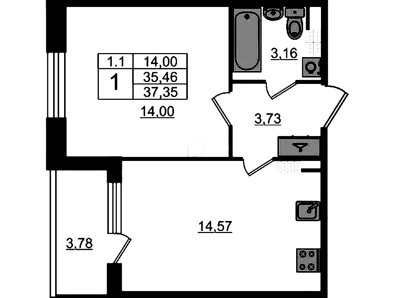 Однокомнатная квартира на 5-ом этаже 35,46 кв.м