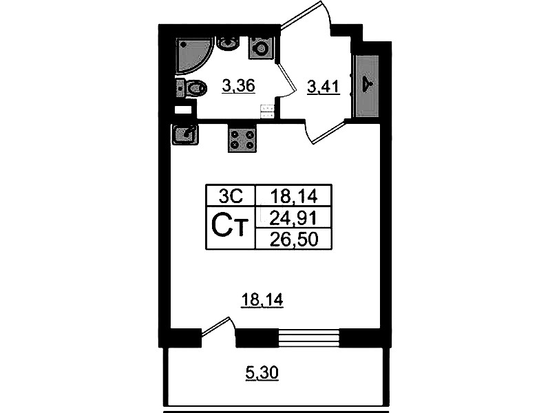 Квартира-студия на 2-ом этаже 24,91 кв.м