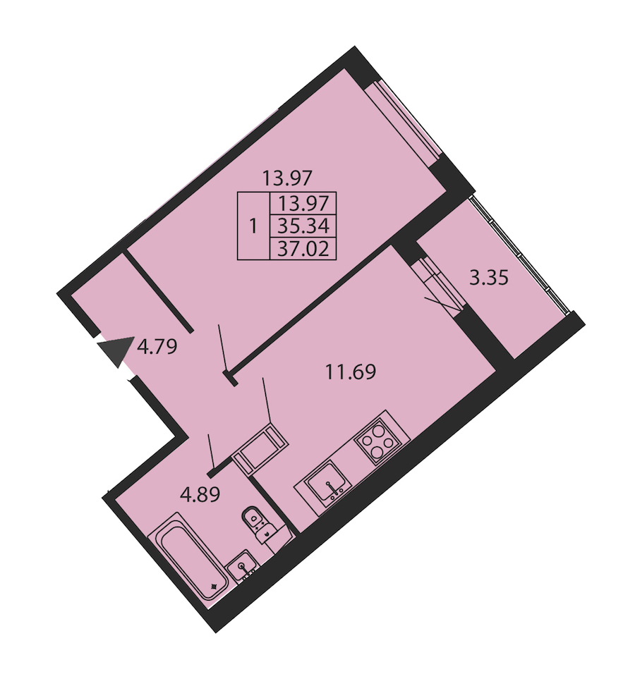 Однокомнатная квартира на 2-ом этаже 35,34 кв.м