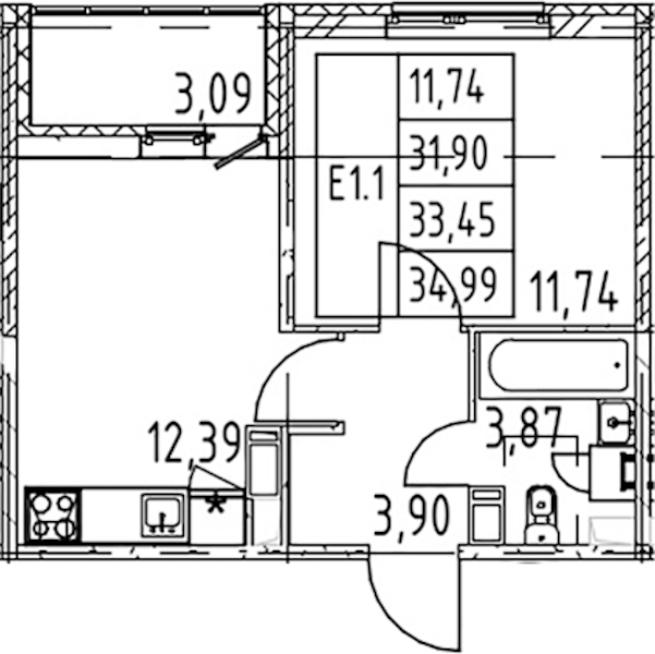 Однокомнатная квартира на 12-ом этаже 31,9 кв.м