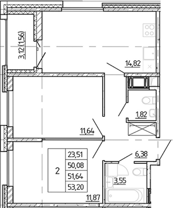 Двухкомнатная квартира на 12-ом этаже 50,08 кв.м