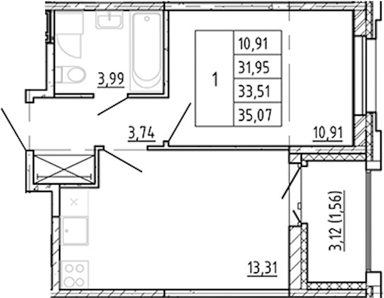 Однокомнатная квартира на 5-ом этаже 31,95 кв.м
