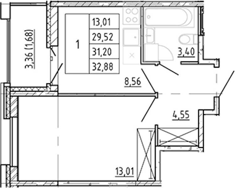 Однокомнатная квартира на 12-ом этаже 29,52 кв.м