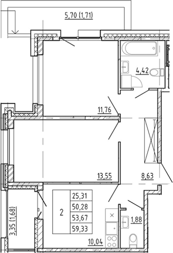 Двухкомнатная квартира на 12-ом этаже 50,28 кв.м