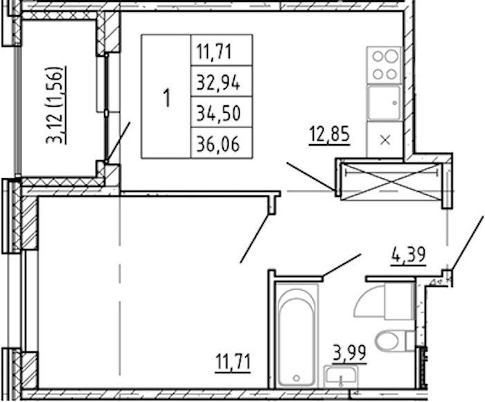 Однокомнатная квартира на 10-ом этаже 32,94 кв.м