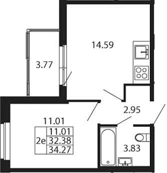 Однокомнатная квартира на 3-ем этаже 32,38 кв.м