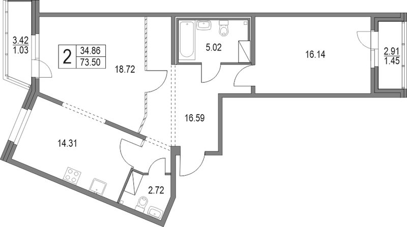 Двухкомнатная квартира на 6-ом этаже 73,5 кв.м