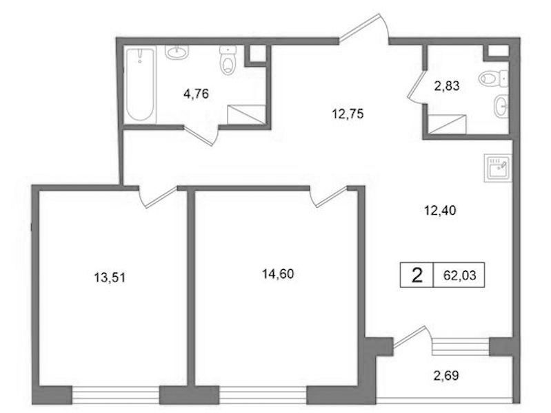 Двухкомнатная квартира на 2-ом этаже 62,03 кв.м