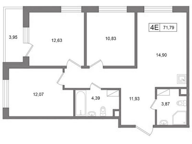 Трёхкомнатная квартира на 4-ом этаже 71,79 кв.м