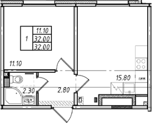 Однокомнатная квартира на 1-ом этаже 32 кв.м