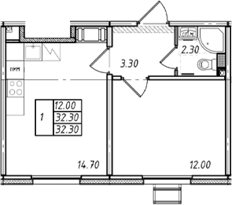 Однокомнатная квартира на 2-ом этаже 32,3 кв.м