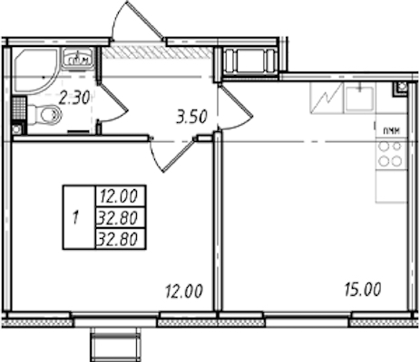 Однокомнатная квартира на 14-ом этаже 32,8 кв.м