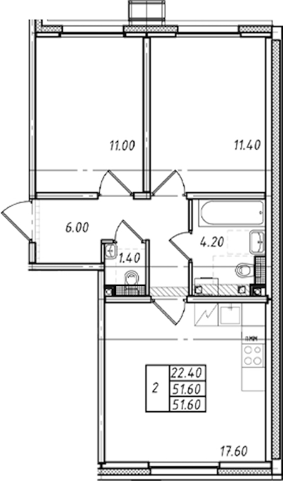 - Площадь51,6 м2