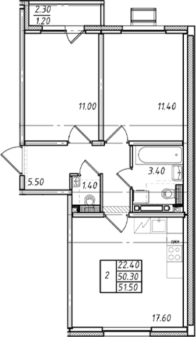 Двухкомнатная квартира на 12-ом этаже 51,5 кв.м