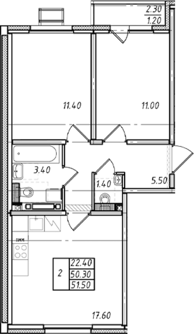 Двухкомнатная квартира на 14-ом этаже 51,5 кв.м