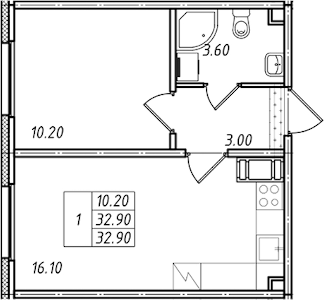 Однокомнатная квартира на 2-ом этаже 32,9 кв.м