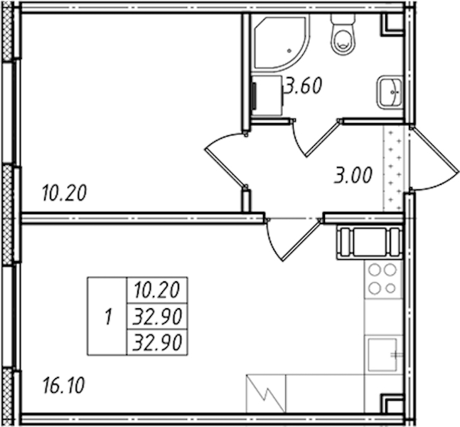 Однокомнатная квартира на 16-ом этаже 32,9 кв.м