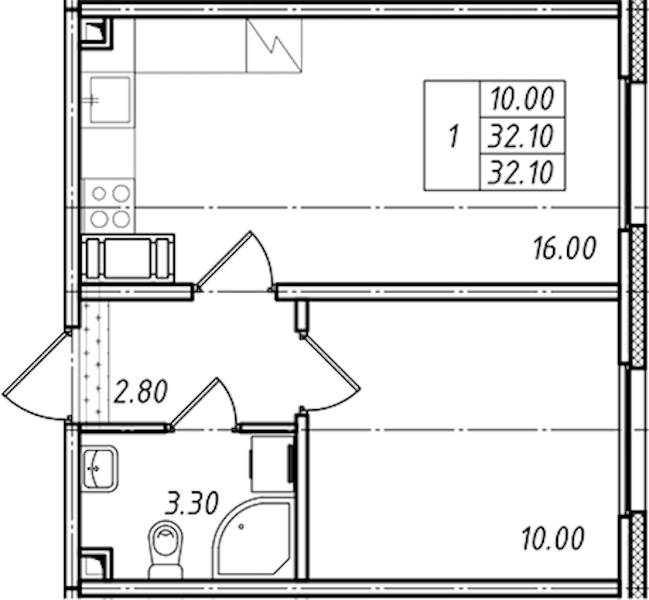 Однокомнатная квартира на 15-ом этаже 32,1 кв.м